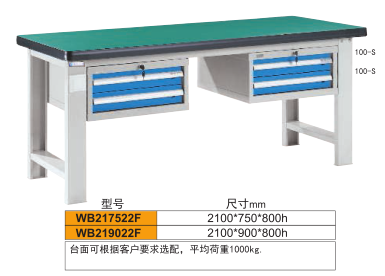 工作臺介紹WB217522: 工作臺采用優(yōu)質(zhì)冷扎板精工制作而成,堅(jiān)固的工作桌框架,牢固平穩(wěn),可使工作桌承重1000kg;多種工作桌面選擇,可配合不工使用的要求; 工具吊柜(箱),側(cè)柜(箱)燈架,調(diào)節(jié)腳杯,外形美觀;層板,抽屜質(zhì)量上乘,承重大,抽屜內(nèi)可根據(jù)需要任意分隔;節(jié)約空間,適用性強(qiáng)