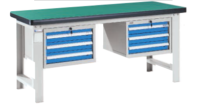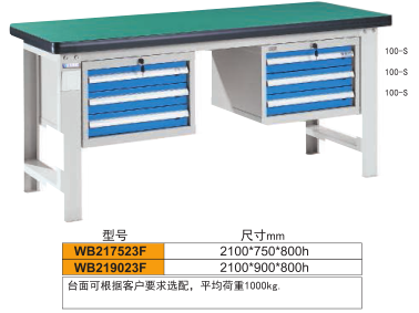 工作臺介紹WB-217523: 工作臺采用優(yōu)質(zhì)冷扎板精工制作而成,堅固的工作桌框架,牢固平穩(wěn),可使工作桌承重1000kg;多種工作桌面選擇,可配合不工使用的要求; 工具吊柜(箱),側(cè)柜(箱)燈架,調(diào)節(jié)腳杯,外形美觀;層板,抽屜質(zhì)量上乘,承重大,抽屜內(nèi)可根據(jù)需要任意分隔;節(jié)約空間,適用性強