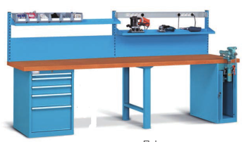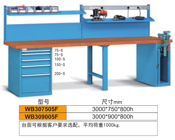 工作臺WB307505介紹: 工作臺采用優(yōu)質(zhì)冷扎板精工制作而成,堅固的工作桌框架,牢固平穩(wěn),可使工作桌承重1000kg;多種工作桌面選擇,可配合不工使用的要求; 工具吊柜(箱),側(cè)柜(箱)燈架,調(diào)節(jié)腳杯,外形美觀;層板,抽屜質(zhì)量上乘,承重大,抽屜內(nèi)可根據(jù)需要任意分隔;節(jié)約空間,適用性強