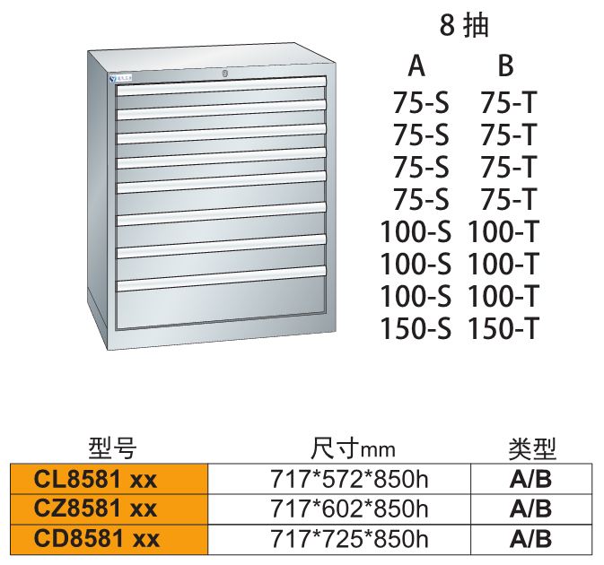 工具柜工具柜C-8581介紹:工具柜適用于工具、刀具、零部件在生產(chǎn)現(xiàn)場(chǎng)中的定置管理,8抽抽屜式設(shè)計(jì),使你的物品存取工作真正做到準(zhǔn)時(shí)、準(zhǔn)確、卓效、低耗。