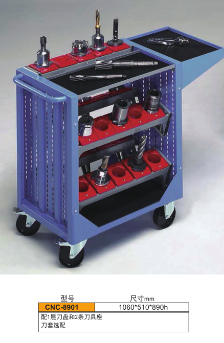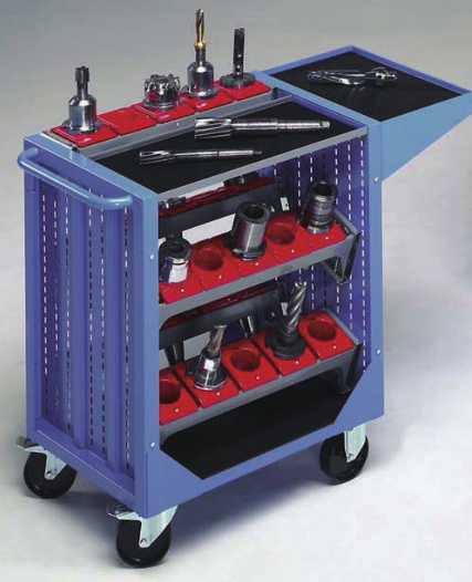 刀具車(chē)是存放、搬運(yùn)刀具的裝備,這里以‘現(xiàn)代貨架廠’生產(chǎn)的HY-HSK系列型號(hào)為例,此類(lèi)刀具車(chē)可存BT30、BT40、BT50、HSK63、HSK100等多種型號(hào)的刀具。多邊成型的整體式側(cè)板上有模數(shù)化的人字孔,可將刀座按水平或15°、30°傾斜放置,方便多種刀具的存取。HY-HSK系列可根據(jù)需要選擇帶抽屜或不帶抽屜的刀具車(chē)。