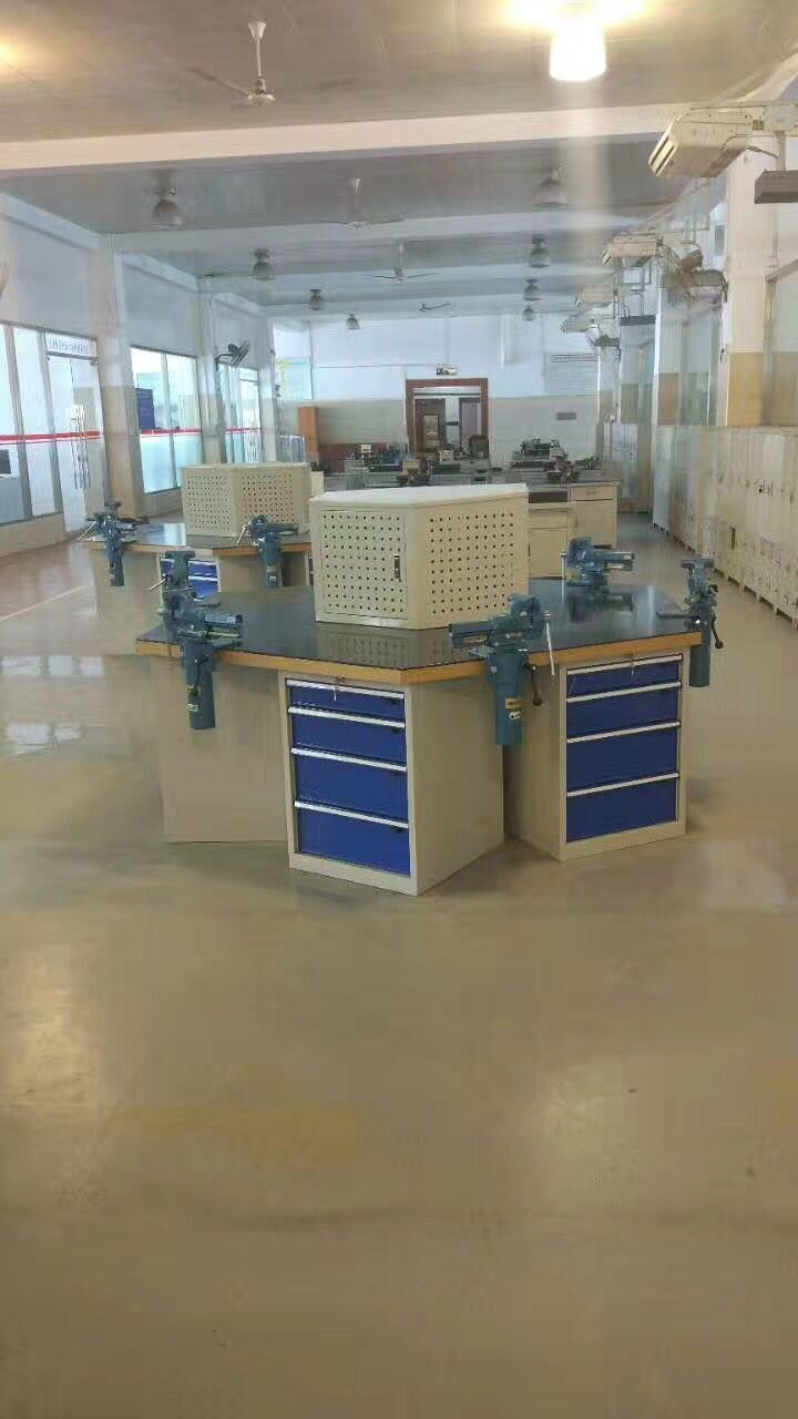 六角工作臺顧名思義其有六個角六個工位,是由六個工位以弧形方式圍著坐成一圈。其特點是節(jié)省空間適合以小組為單位培訓(xùn)及作業(yè),如此提高工作效率。 六角工作臺一般適合于學(xué)校精工實習(xí)教學(xué)方面和公司工廠團(tuán)體小組協(xié)作完成生產(chǎn)工作。 1,尺寸:每個工位邊長為1200mm,落地高度為700MM臺面采用50mm厚的綠色高分子復(fù)合桌面或櫸木桌面,鐵板合成桌面; 2,臺子配置6個落地柜,每個落地可配抽抽斗,可調(diào)擱板。 3,柜體采用1.2mm厚優(yōu)質(zhì)冷軋板精工制作而成。 4,臺面上一般可配4寸或6寸或8寸大小的6個臺虎鉗。 5,臺面上可配電源島,或工具掛板,看板。